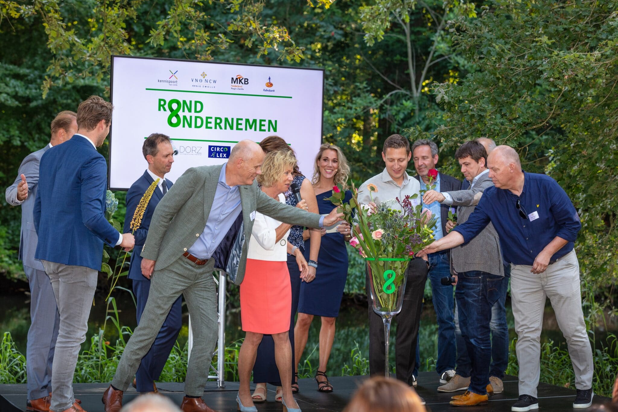 Begin september onderstreepte Trudy Huisman, voorzitter van de Economisch Board Regio Zwolle, de rol van Rond Ondernemen in de circulaire ontwikkeling en de toekomstbestendigheid van Regio Zwolle. Dat deed zij tijdens een symbolisch overhandigingsmoment van een kleurig boeket bloemen aan de 150 deelnemers van de Ondernemersborrel van VNO-NCW Midden en MKB Regio Zwolle. “Dit boeket staat symbool voor de diversiteit in de regio maar ook voor de kracht van goed samenwerken.”