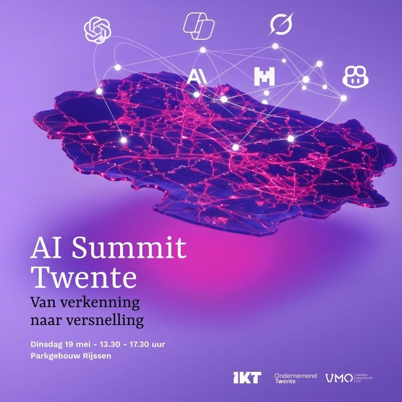 Daarom organiseren we samen met IKT en Ondernemend Twente op 19 mei de AI Summit Twente – voor ondernemers, bestuurders en AI-koplopers die willen bijdragen aan een toekomstbestendige regio.